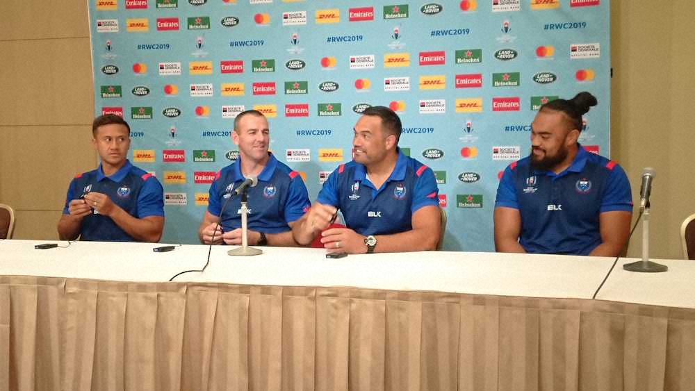 ラグビーW杯1次リーグA組のサモアは3日、名古屋市内のホテルで会見し、日本戦(5日、豊田ス)の登録メンバー31人を発表した。0―34で完敗したスコットランド戦(9月30日)から中4日の日程で、先発を6人変更。スコットランド戦でイエローカード2枚により退場処分を受けながら、2度目の反則となったプレーがイエローに相当しないとして日本戦の出場が認められたWTBフィドウも先発に名を連ねた。