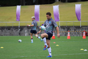 練習の合間にリフティングをするスコットランドのレイドロー(撮影・中出健太郎)