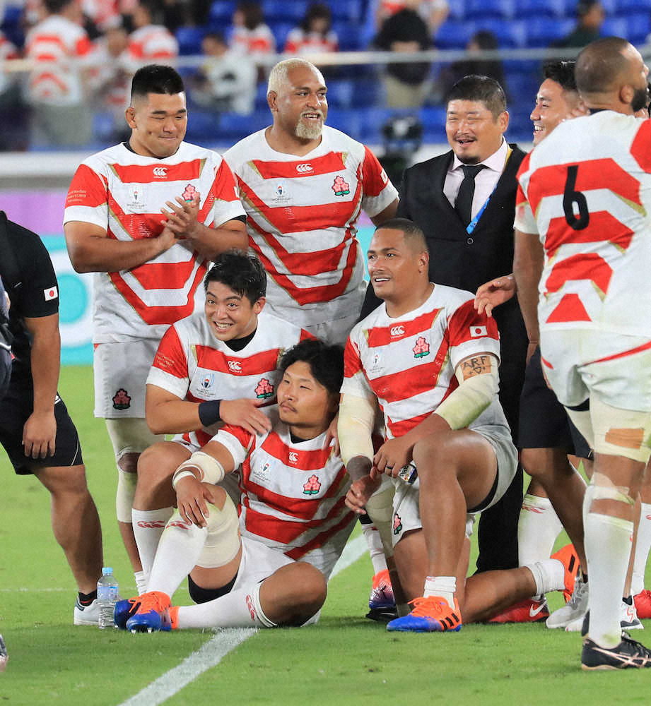 ラグビーW杯1次リーグ最終戦でスコットランドを破り、記念写真に納まる日本フィフティーン Photo by 共同 稲垣 代表初トライで“空白地”埋めた! それでも「笑ったことないですね」 ギャラリーで見る この記事のフォト 2019年10月14日の画像一覧 もっと見る 2019年10月14日の画像をもっと見る