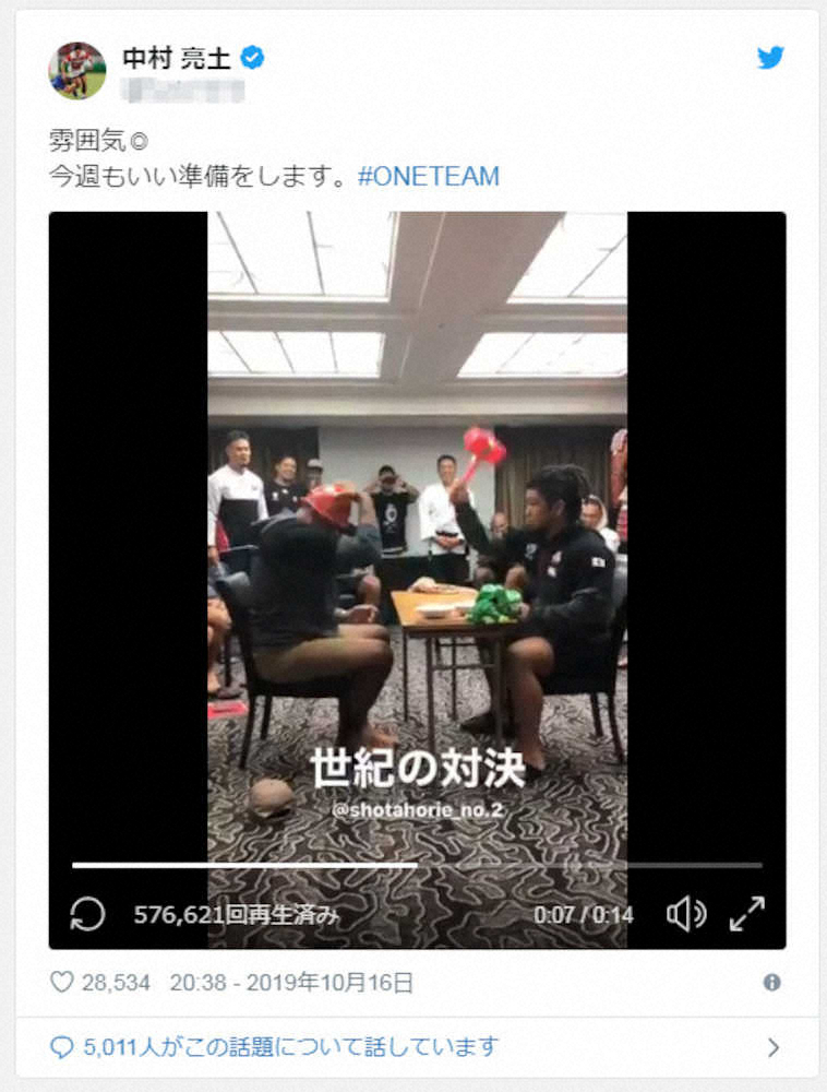 ジャパンは、レクリエーションでも「ONE TEAM」だ。16日夜、CTB中村がツイッターに連投した動画が話題沸騰中だ。