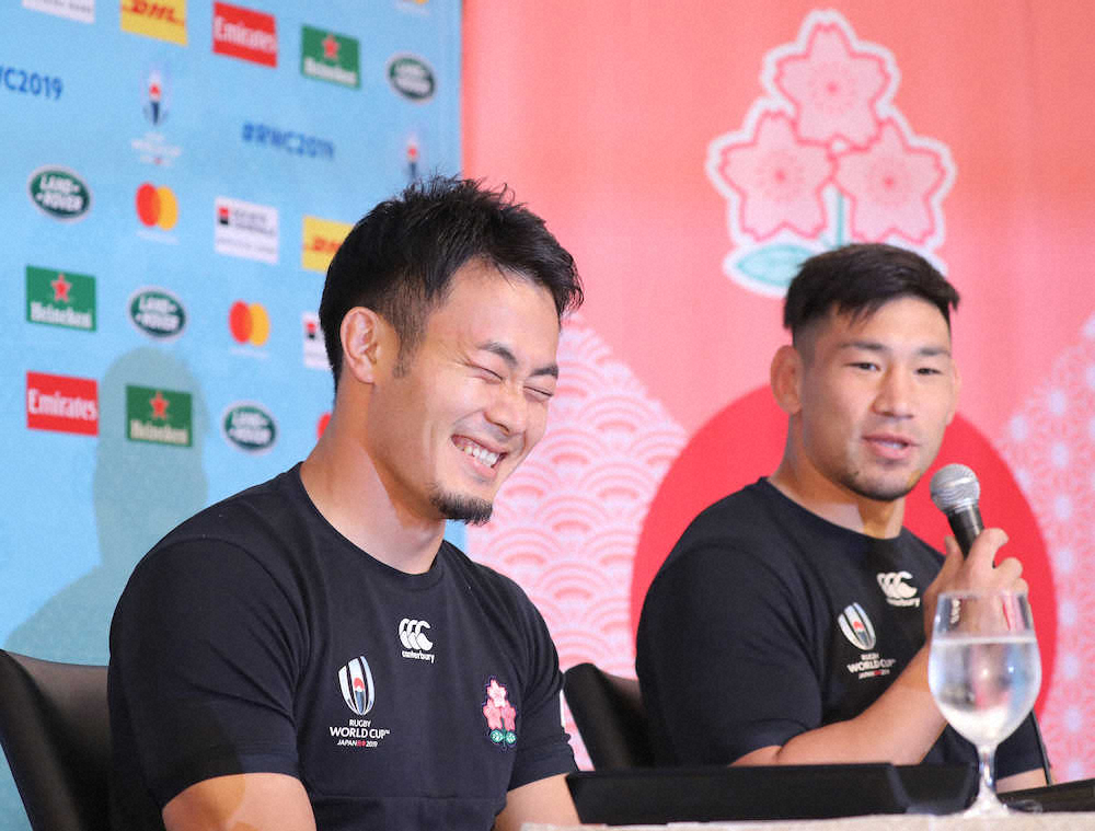 日本代表が18日、都内で南アフリカ戦に向けたメンバー23人を発表した。4戦連続でCTBで先発する中村亮土(28=サントリー)が、WTB福岡堅樹(27=パナソニック)と会見に出席。1発目から「松島と福岡が何トライするか?」と恒例の質問が飛んだ。中村は苦笑いしながら「何トライしますか?」と福岡を横目に切り出し「2トライずつはしてほしい。2人はトライ数で大会でトップの中にいるので、トライ数でトップを目指しながら、そこを意識してやってほしい」と厳命した。