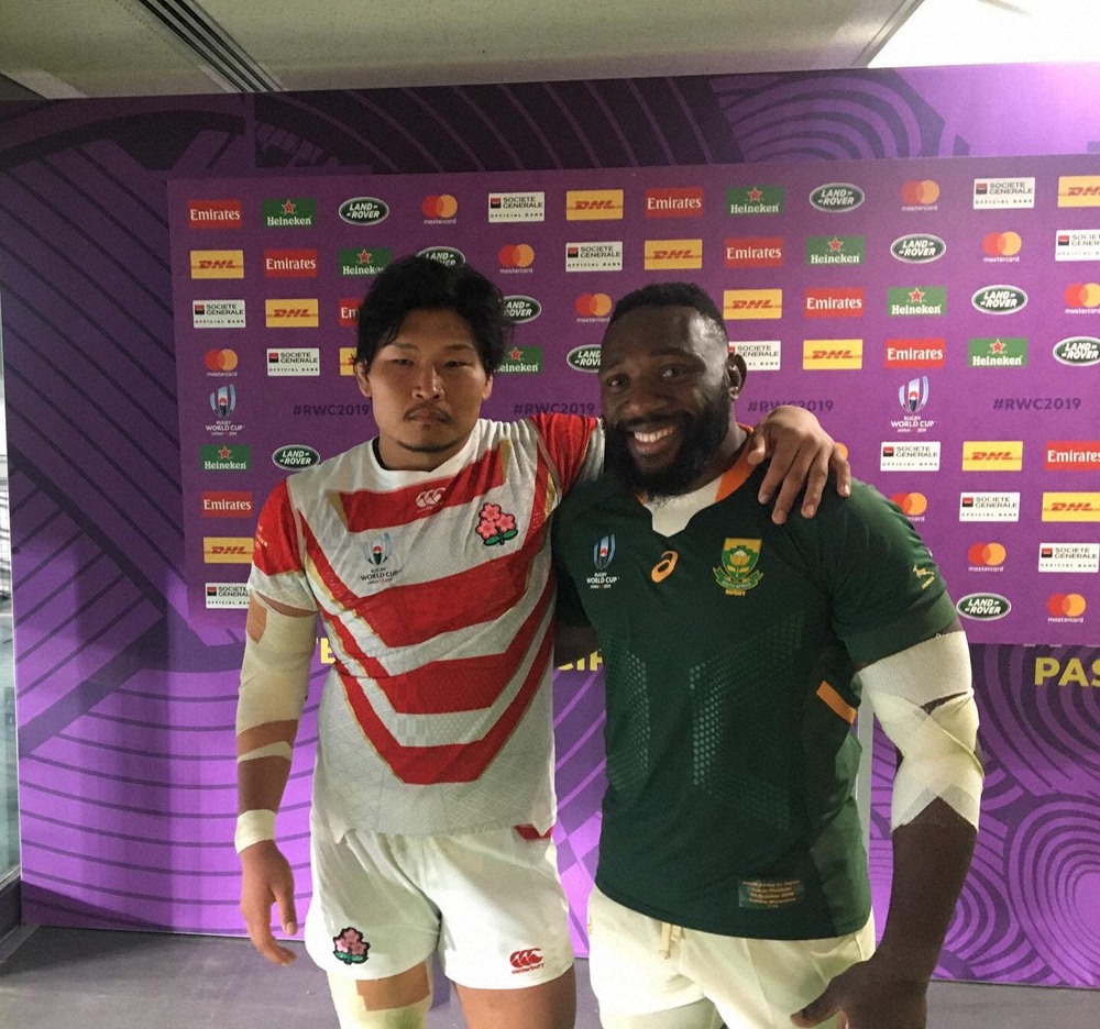 南アフリカのムタワリラ(右)と肩を組む稲垣啓太(稲垣啓太公式ツイッターより)
