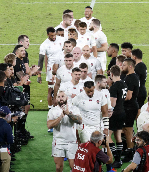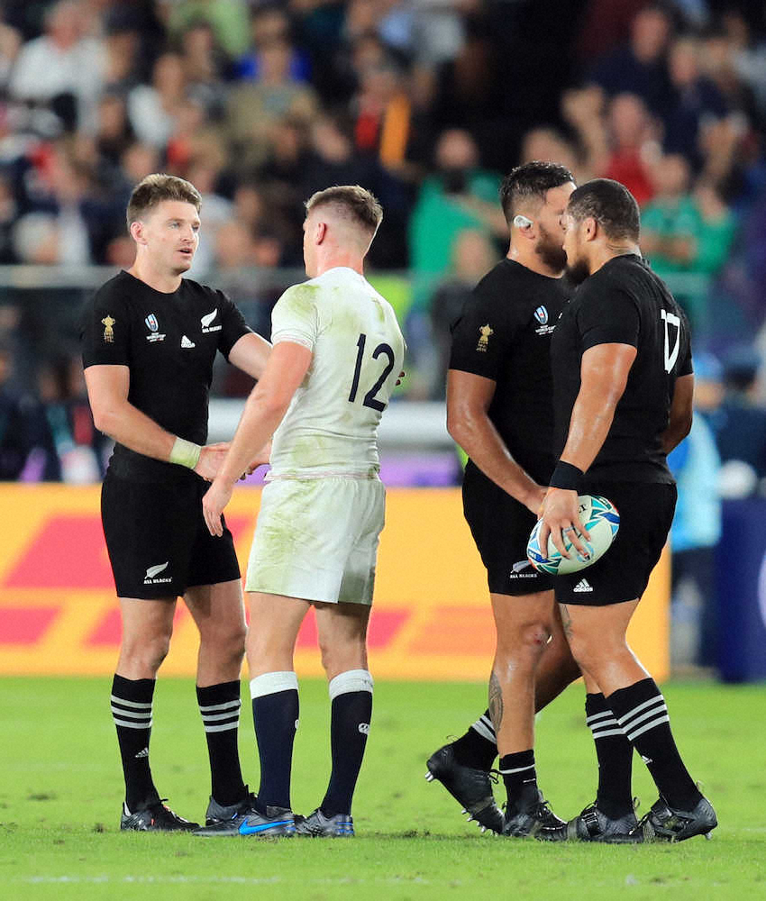 <イングランド・ニュージーランド>試合後あいさつするニュージーランド代表の後方で、ジョーンズHCの勝利監督インタビューを映し出すビジョン(撮影・久冨木 修) Photo by スポニチ オールブラックス、07年大会以来のW杯敗戦 リード主将「試合の中に入れな… ギャラリーで見る この記事のフォト 2019年10月26日の画像一覧 もっと見る 2019年10月26日の画像をもっと見る