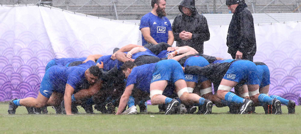 <ニュージーランド代表練習>雨の中、スクラムを組むニュージーランドFW陣(撮影・吉田 剛)