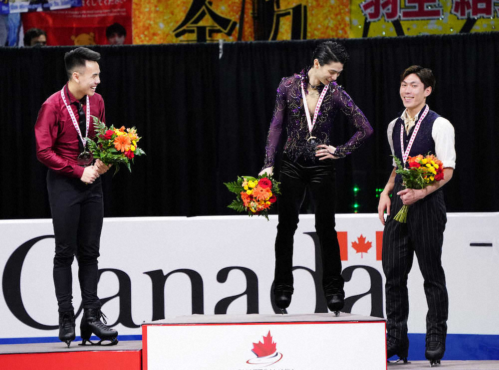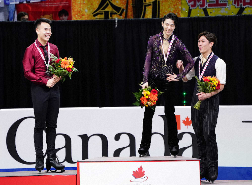 <スケートカナダ・男子フリー>メダルをかざす左からナム・ギュエン、羽生結弦、田中刑事(撮影・長久保 豊)