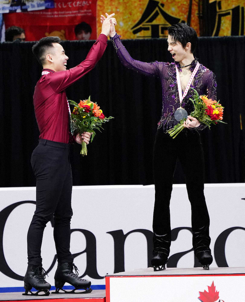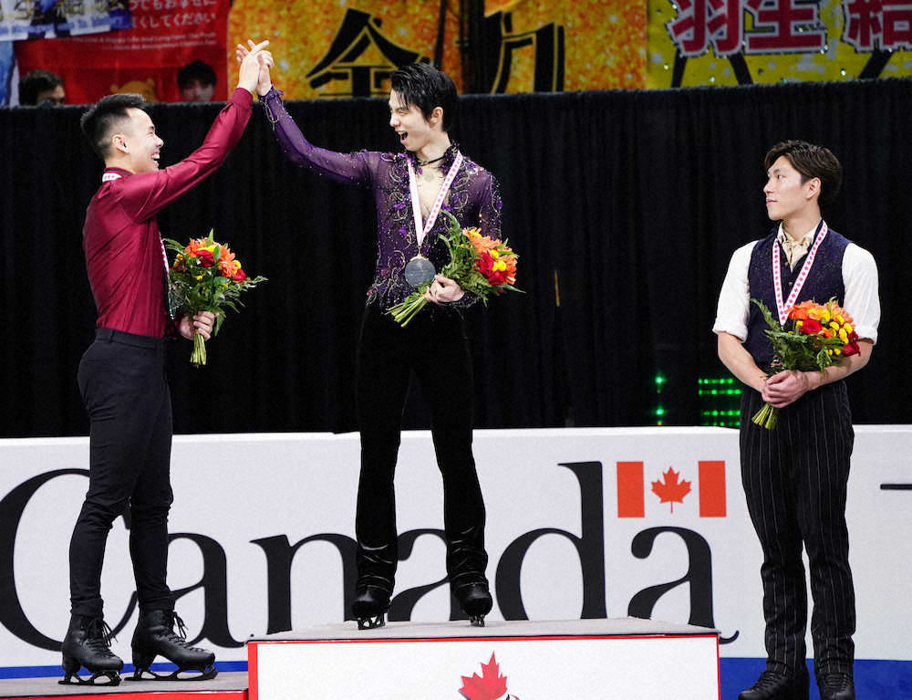 <スケートカナダ第2日>表彰式でナム・ニュエン(左)とハイタッチする羽生結弦(撮影・小海途 良幹)