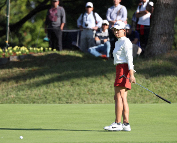 この日は第2Rの未消化分の3ホールを回り、第3Rに向かった。2番でグリーン手前ラフからのアプローチが傾斜で戻りボギーが先行すると、10番でもアプローチが「キャリーでどっか~ん」と6メートルオーバーしてボギー。重点的に練習してきたのがアプローチだっただけに「もったいないですよね」と唇をかんだ。