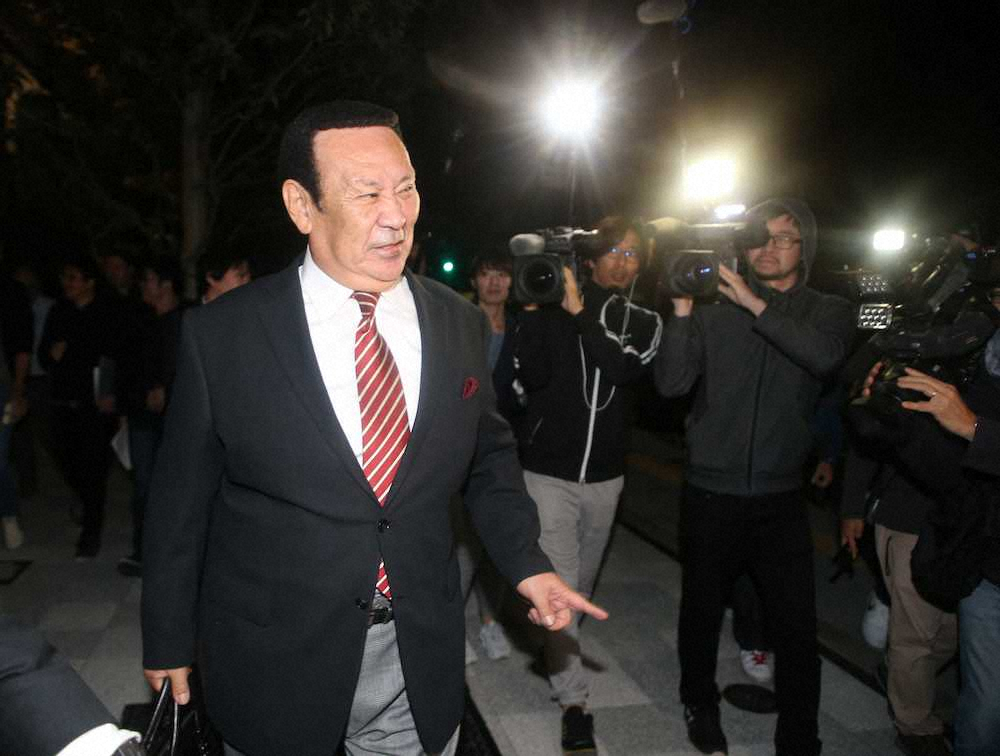 <テコンドー協会騒動関連>報道陣の質問に答えながら帰途につく金原会長(撮影・大塚 徹)
