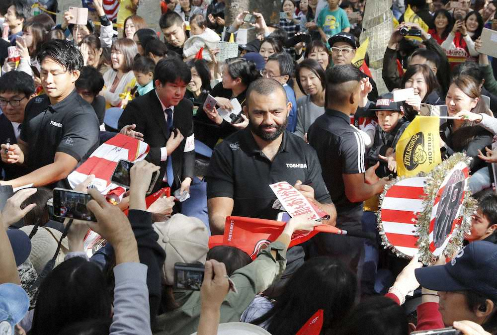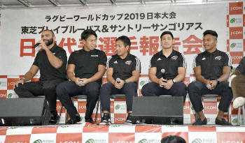 東京都府中市で行われた報告会に参加した、ラグビー日本代表の(左から)リーチ主将、徳永、流、中村、松島 Photo by 共同 リーチ、松島幸太朗ら激戦語る 応援に感謝 東京・府中でラグビーW杯報告会 ギャラリーで見る この記事のフォト 2019年11月02日の画像一覧 もっと見る 2019年11月02日の画像をもっと見る
