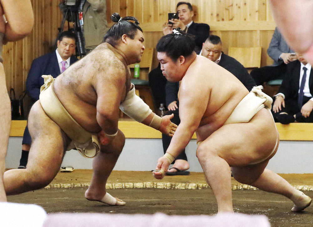 カド番の大関・高安は不安を残す内容だった。婚約者で演歌歌手の杜このみが見守る中、出稽古に来た豪栄道と10番取ったが、1勝のみ。何度も土俵に転がされ「自分の形になれない相撲が多かった」と首をかしげた。