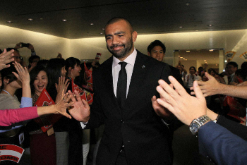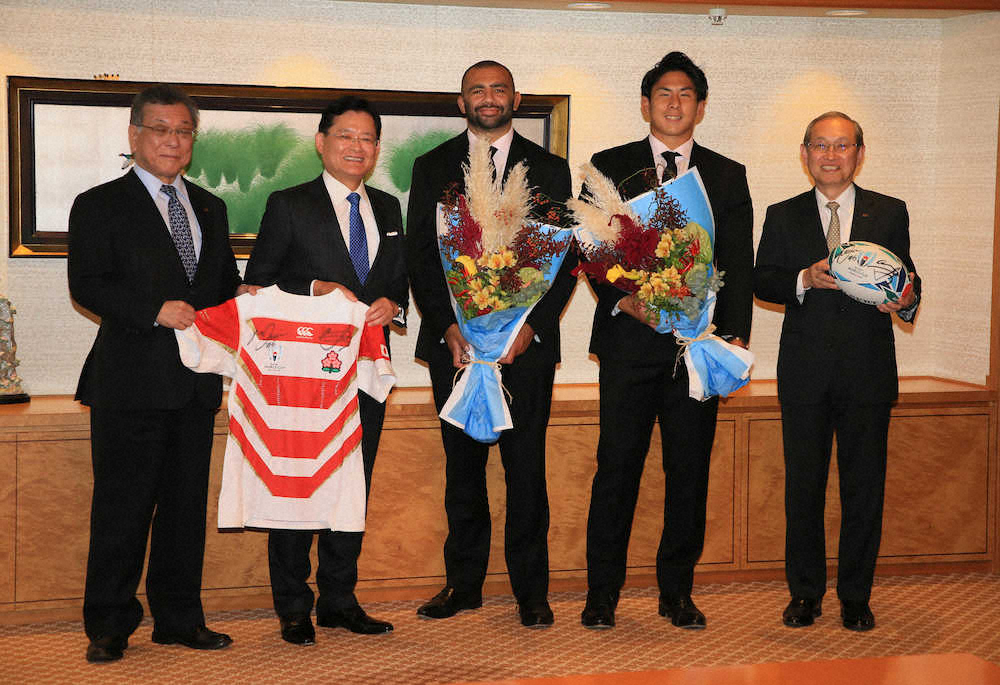 ラグビー日本代表のリーチ・マイケル(31)、徳永祥尭(27=ともに東芝)が5日、東京都港区の東芝浜松町本社を訪れ、同社の車谷暢昭会長、綱川智社長らに今月2日に閉幕したW杯日本大会の報告を行った。