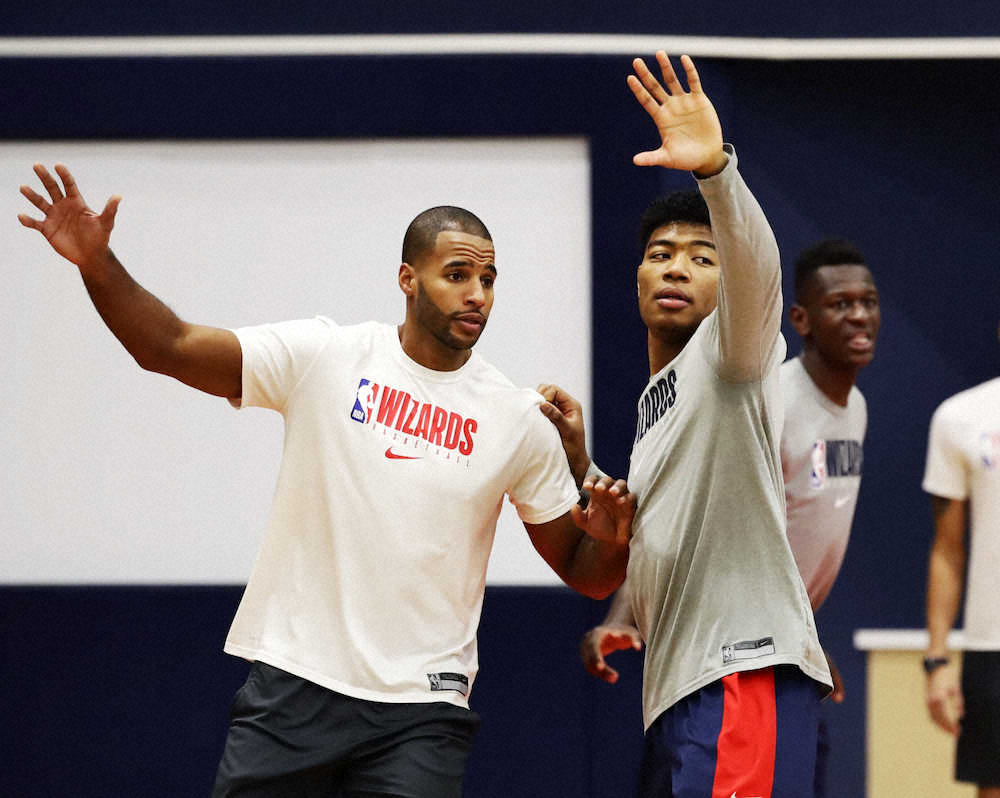 ペーサーズ戦に向けて調整するウィザーズの八村(右)