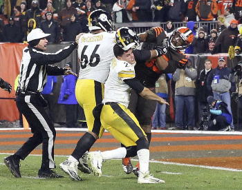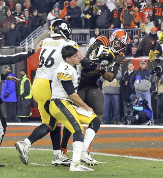 14日に地元クリーブランド(オハイオ州)で行われたスティーラーズ戦の終了間際、相手の新人QBメイソン・ルドルフ(24)からヘルメットをもぎとり、それを振り回して殴打しようとした信じられないラフプレーに対しての処分。2017年ドラフトで全体トップで指名され、今季は10試合でQBサックを10回記録していたが戦列に復帰できるかどうかは不透明になった。