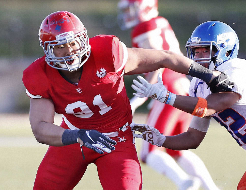 アメリカンフットボール関東大学リーグの横浜国立大戦に出場した日大の宮川選手(左)