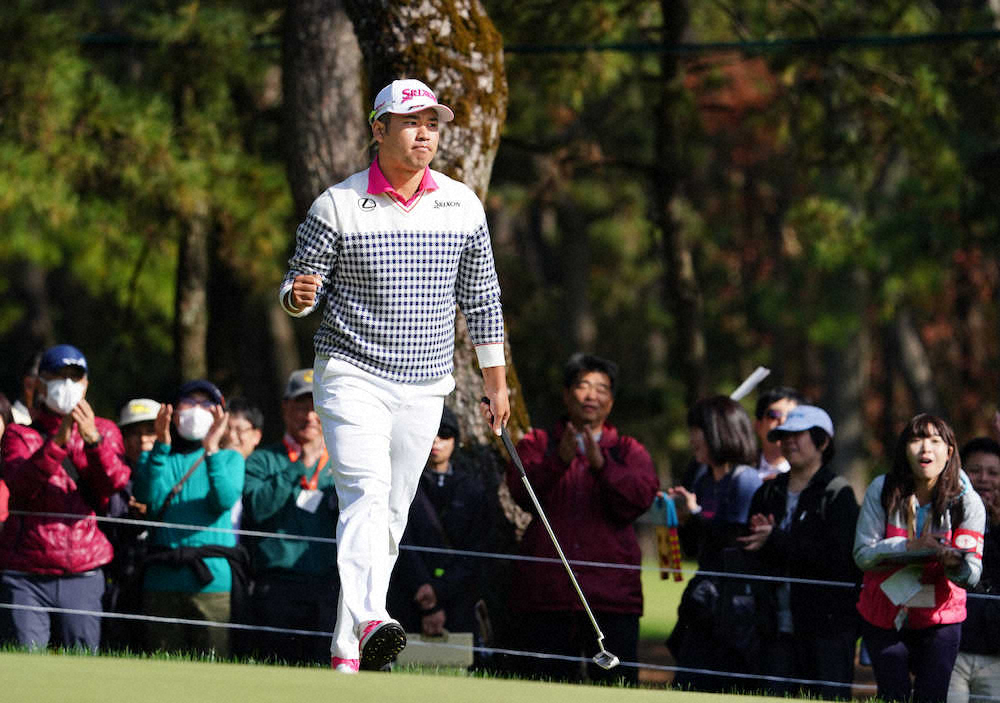 17番、長いパーパットを沈めガッツポーズする松山(撮影・沢田 明徳)