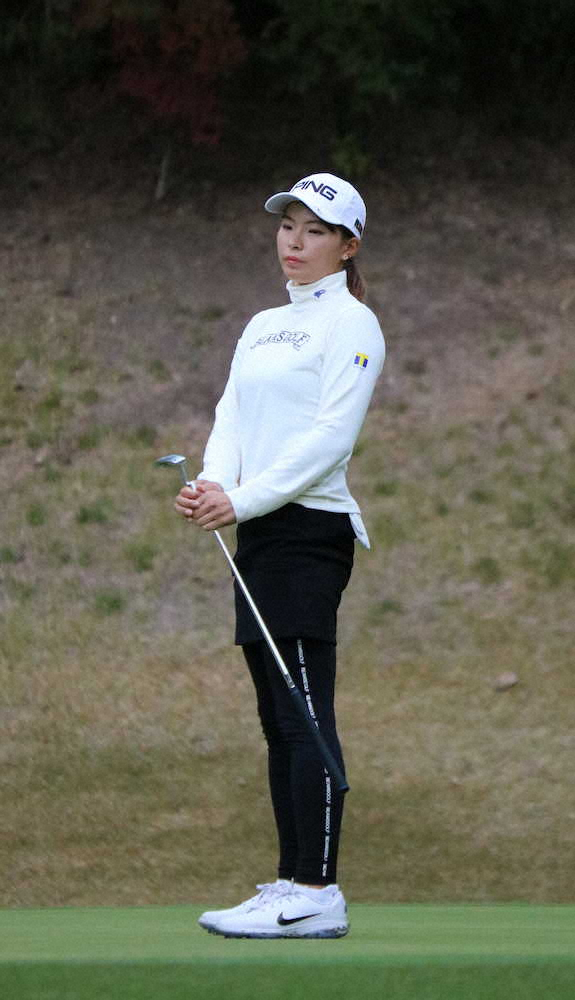 首位に2打差の2位グループからスタートした賞金ランク3位・渋野日向子(21=RSK山陽放送)は前半のアウトを3バーディー、2ボギーの35で折り返し、首位とは5打差の5位グループまで順位を下げた。4番パー4(320ヤード)で第2打をピン手前1メートルにつけてこの日最初のバーディーを奪い、続く5番パー5(485ヤード)では3メートルのイーグルパットを外したが、連続バーディー。一時は首位をうかがう勢いだったが、7番パー4(400ヤード)で12メートルを3パットしてボギーを叩くと、続く8番パー3(150ヤード)でも第1打をグリーン右手前のバンカーに入れて連続ボギーを叩いた。