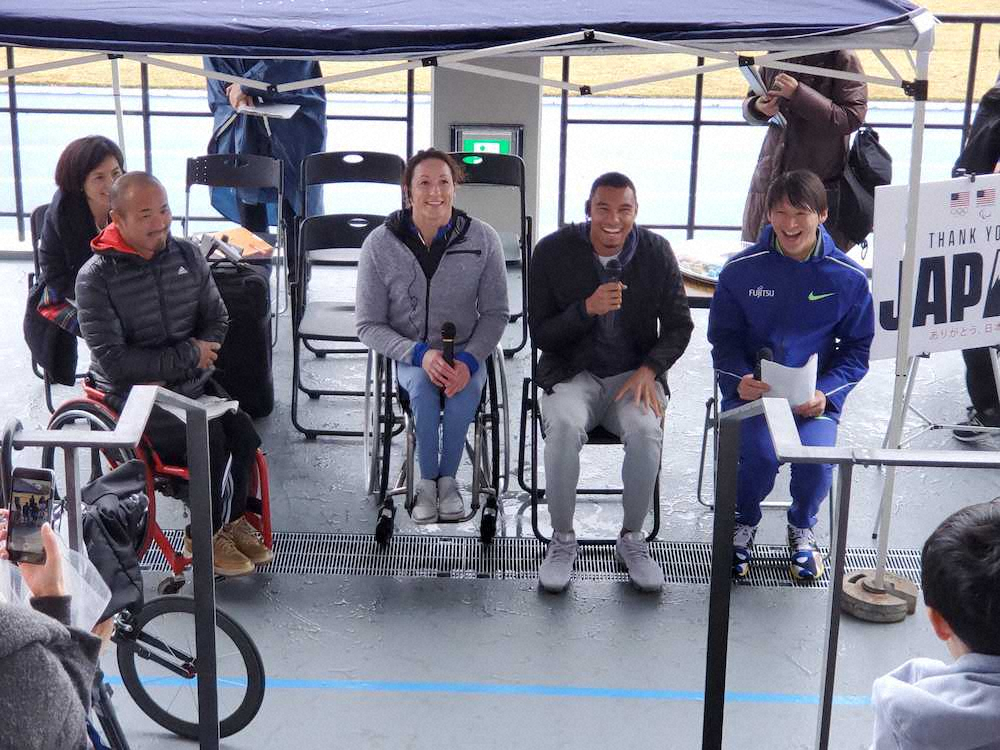 陸上の米国代表が東京五輪、パラリンピック期間中に練習拠点とする世田谷区立総合運動場陸上競技場のオープニングイベントが23日に開かれ、400メートル室内世界記録保持者で日本人の母を持つマイケル・ノーマン(21)、夏冬両パラリンピックで合計17個のメダルを獲得している車いすランナーのタチアナ・マクファデン(30=ともに米国)らが参加した。