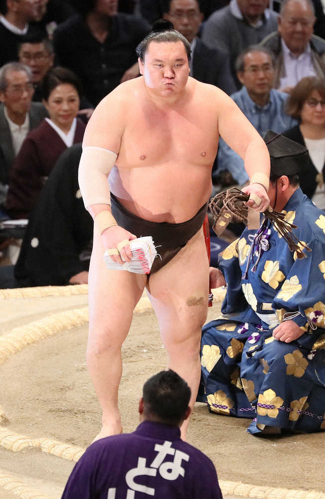 白鵬は御嶽海を下して優勝を決め懸賞金をわしづかみする(撮影・岩崎 哲也)