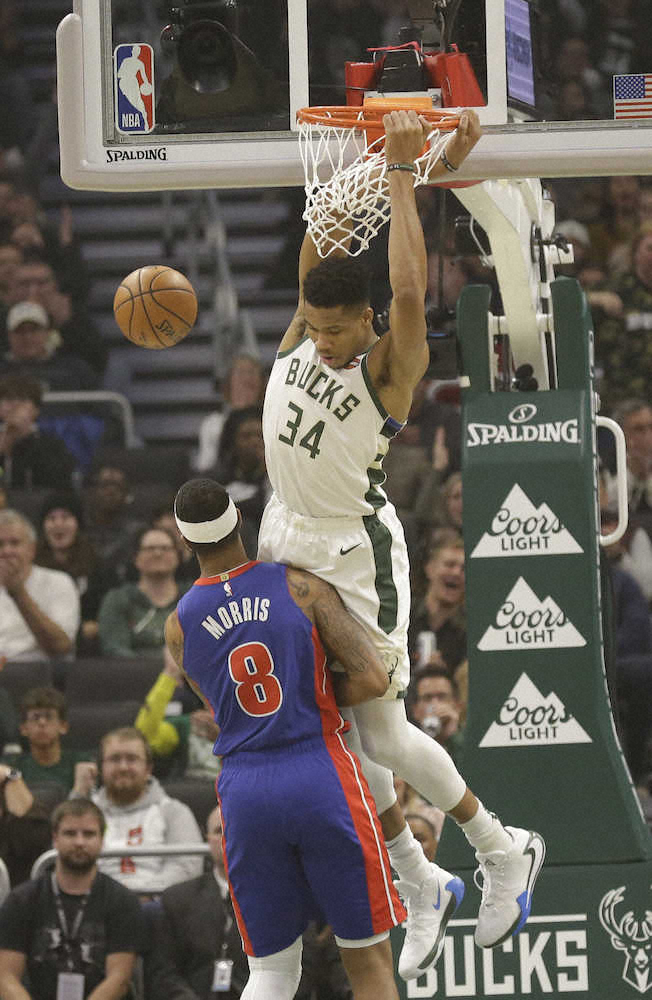 NBAは23日に各地で10試合を行い、東地区全体で首位に立っているバックスは地元ミルウォーキー(ウィスコンシン州)でピストンズを104―90(前半54―47)で退けて13勝3敗。昨季のMVPに選出されたヤニス・アデトクンボ(24)が28得点と10リバウンドを稼いでチームを7連勝に導いた。