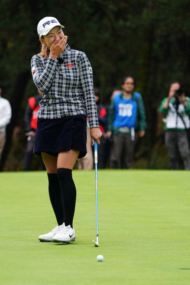 アイアンでのパッティングが大きくショートし苦笑いの渋野(撮影・沢田 明徳)