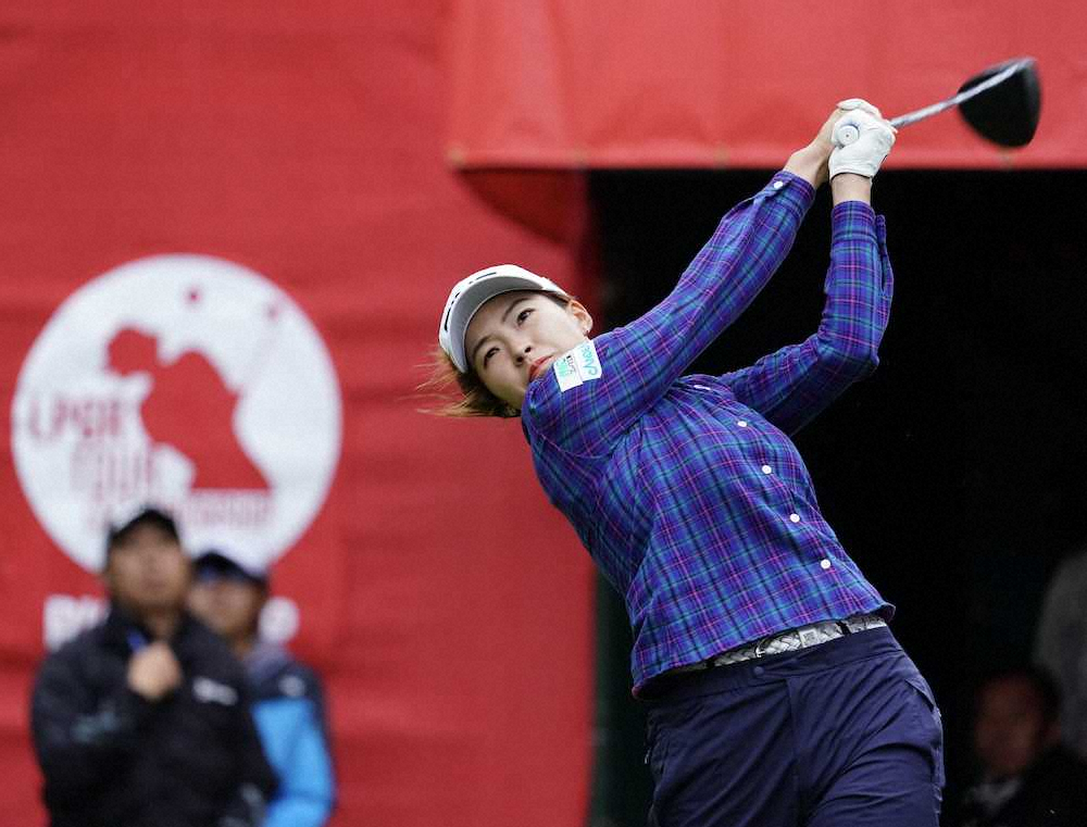 <LPGAツアー選手権リコー杯初日>1番、ティーショットを放つ渋野(撮影・沢田 明徳)