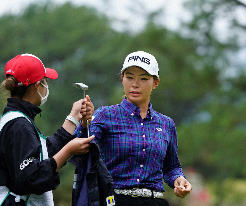 <LPGAツアー選手権リコー杯初日>ホールアウトし笑顔でキャディーと握手する渋野日向子(撮影・沢田 明徳)
