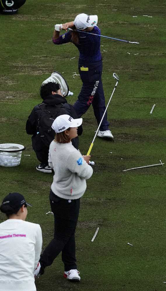 <LPGAツアー選手権リコー杯初日>練習場で並んで練習する(手前から)鈴木愛、渋野日向子、申ジエ(撮影・沢田 明徳)
