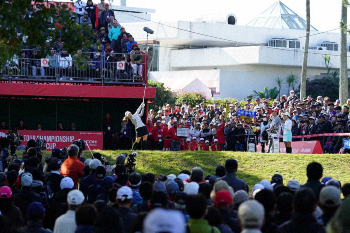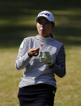 【9番490ヤード パー5】ティーショットは右のラフ。2打目はグリーン手前に。カップまで約40ヤードの第3打はカップに当たり、もう少しでイーグルのナイスショット。大歓声のなか、30センチをお先に、でバーディー。アウトは2つ伸ばし、この時点では後ろを回るテレサ・ルーに並び首位となったが、テレサ・ルーも9番でバーディーを取り2位で折り返した