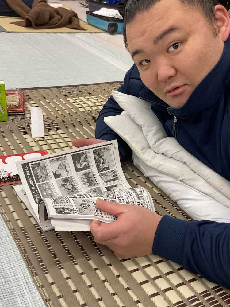 支度部屋で相撲雑誌を読んでくつろぐ朝乃山