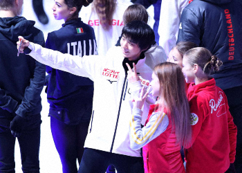 ▽10:17 リハーサルで一度、リンク中央へ。近くにいたアリサ・リュウ(米国)らと会話する。