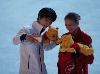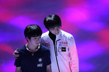 ▽10:16 警備員とみられるスタッフが2人の間に入り、ちゃっかり記念撮影。その後、リンクへと移動。スケーター紹介のリハーサル。スポットライトに照らされると、次に登場する中国ペアの隋文静、韓聡組を紹介する動き。リンク脇に並ぶと、隣に来た同ペアとお辞儀パフォーマンスを見せた。