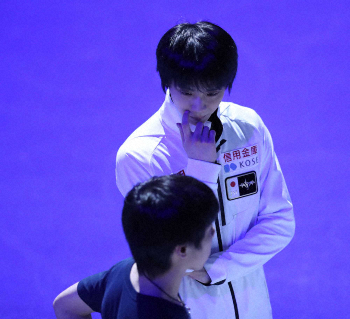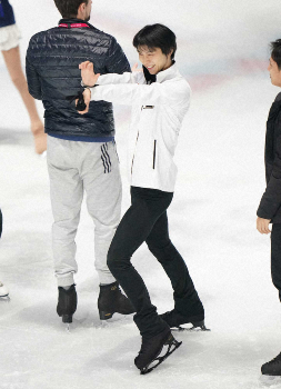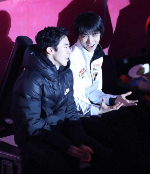 ▽10:05 リンク脇のネーサン・チェン(米国)に近寄り、話し込む。2人は両手をジャージーのポケットに入れ、穏やかな表情でリンクを見つめている。