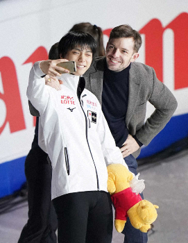 ▽10:24 オンドレイ・ホタレック氏(イタリア)にあいさつ。その後、プーさんのティッシュカバーを持ちながら、ジュニアのスケーターと写真撮影。