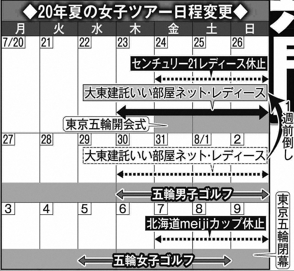 五輪は7月24日に開会式が行われ、8月9日に閉会式を迎える。これまで7月最終週はセンチュリー21レディース、8月第1週は大東建託いい部屋ネット・レディース、同第2週は北海道meijiカップが開催されていた。だが、来季はセンチュリー21レディースと北海道meijiカップが開催を見送り、21年シーズンに復活する予定。また、大東建託いい部屋ネット・レディースは、7月最終週に日程を変更。会場も五輪を考慮し、毎年開かれていた山梨・鳴沢GCから北海道に移る。