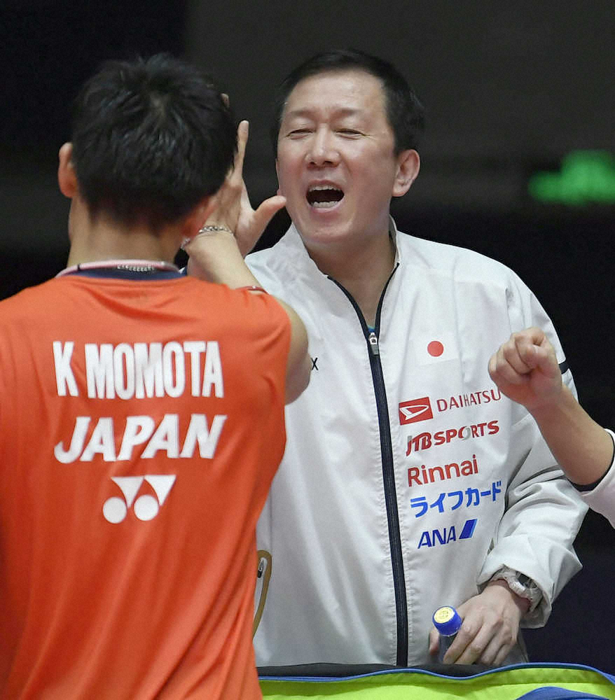 男子シングルスで優勝した桃田(手前)とタッチを交わす日本代表の朴柱奉ヘッドコーチ