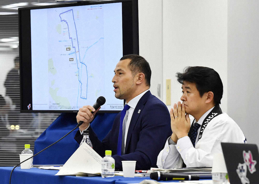 東京五輪のマラソンコースについて記者会見する組織委の室伏スポーツディレクター(左)