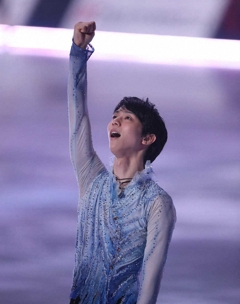 全日本に4年ぶりに出場して2位だった男子の羽生結弦(ANA)は第2部冒頭、世界選手権(20年3月、カナダ)代表と世界ジュニア選手権(20年3月、エストニア)代表のスペシャルコラボレーションに登場した。演目はZARDの代表曲「負けないで」。羽生は右拳を突き上げながら、サビ部分を観客と一緒に熱唱した。