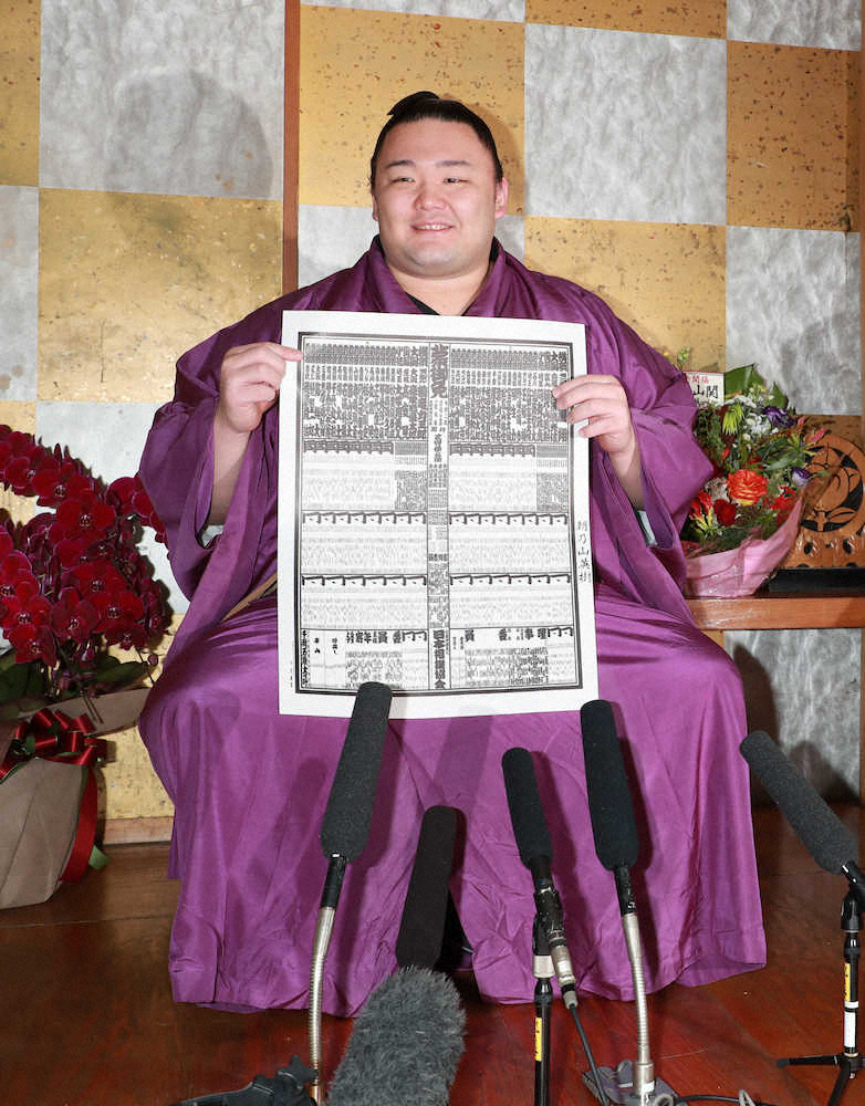 新関脇となった朝乃山(25)は東京都墨田区の高砂部屋で会見し、「うれしい。自分の相撲を取れて2桁勝利したことが良かった。今の番付より、もっと上を目指す。2桁以上を目指したい」と表情を引き締めた。