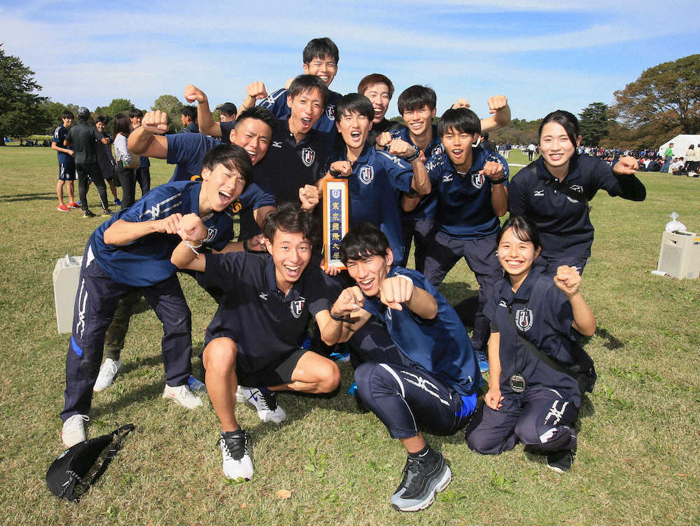 箱根駅伝予選会1位で本戦出場を決めた東京国際大の選手たちは、ガッツポーズで喜びを爆発させる(撮影・尾崎 有希)