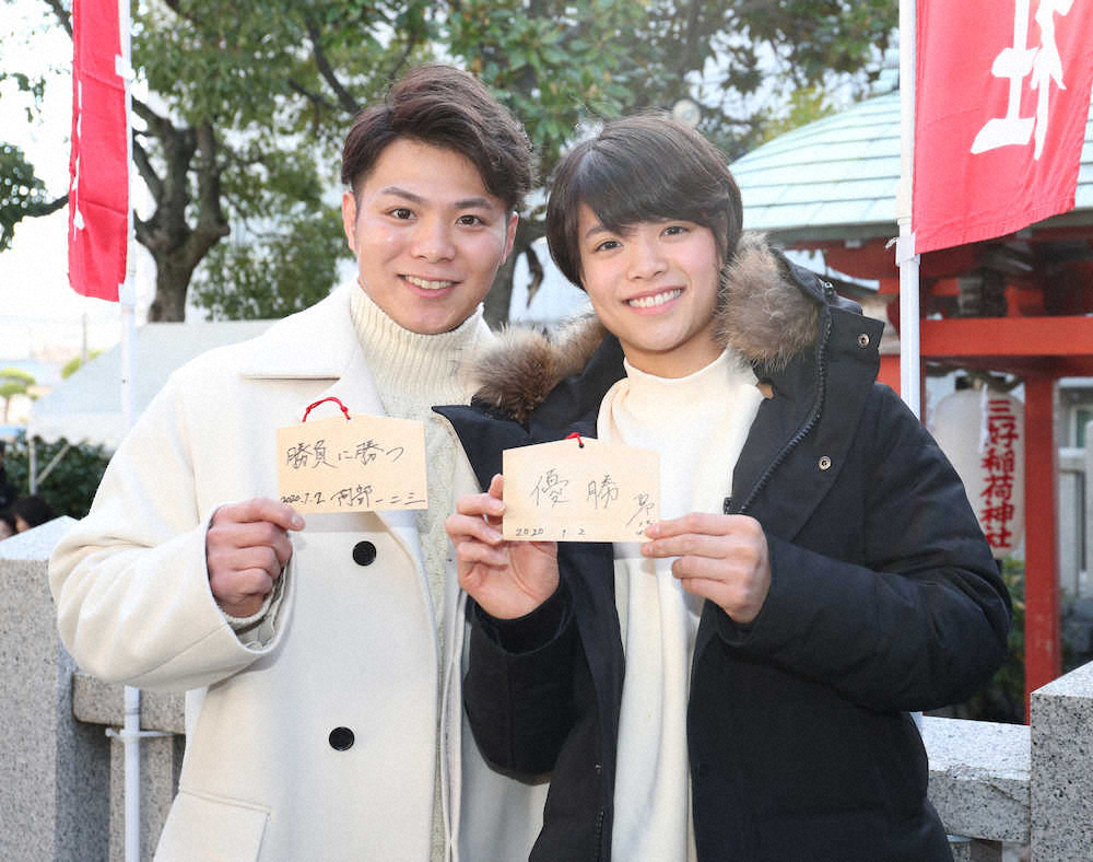 神社に奉納した絵馬には兄が「勝負に勝つ」、妹は「優勝」と書き込み、五輪イヤーとなる20年の目標を表した漢字一文字には兄が「勝」、妹は「お兄ちゃんと同じになるから」と「金」を選んだ。