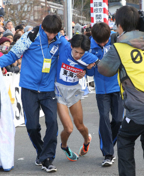 前回王者の東海大が、苦しい状況に追い込まれた。19年大会の5区で区間2位と好走した西田は死力を尽くしてゴールにたどり着いたが、倒れ込んで救護テントに直行。標高874メートルの最高点まで上った後の下りを終えると、「意識がない状態だった」と明かす。区間7位にとどめたが、首位の青学大とは3分22秒差の4位。「70~80秒差をもくろんでいたので…」と両角速監督の表情が曇った。