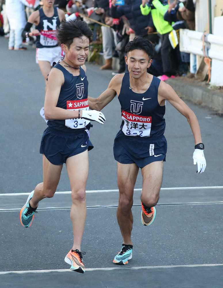 東洋大2区の相沢(右)にタスキをつなぐ1区の西山(撮影・村上 大輔)