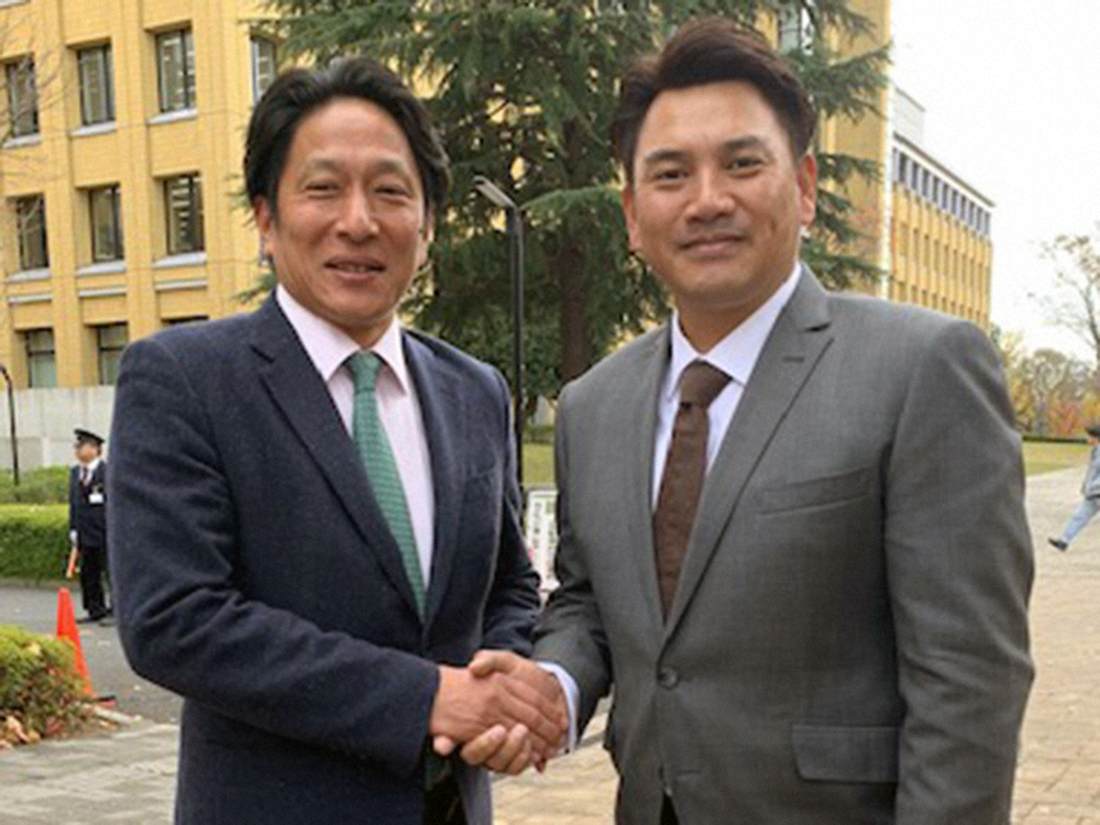 2000安打記念達成プレート除幕式に出席したロッテ・井口監督(右)と握手する原監督