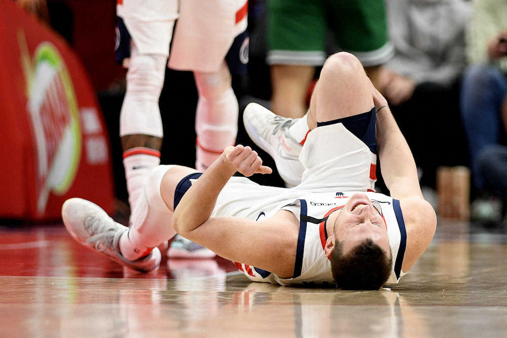 第2Q開始早々、右足首を負傷して倒れこんだウィザーズのマシューズ(AP)