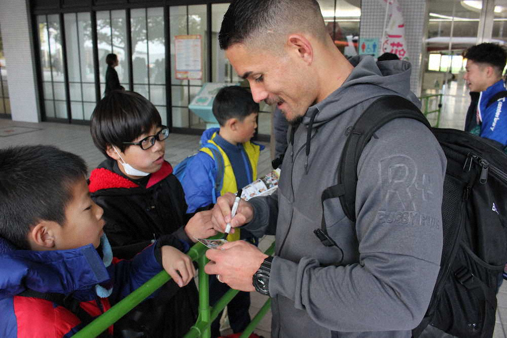 試合後に笑顔でファンにサインする宗像サニックスのFB屋宜ベンジャミンレイ