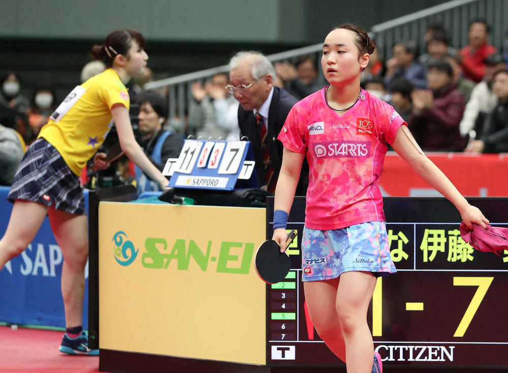目を赤くしながらも、どこかすがすがしさがあった。2ゲームを連取されてから「後半は楽しめた」と挽回。強打の早田にラリーをされないよう、サーブとレシーブで対抗した。第6ゲームはサーブを読み、リターンで4得点。“みまひな”の名勝負に、場内から何度も拍手が起きた。