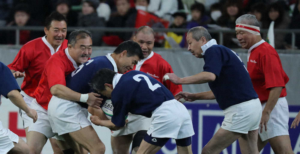 この日は“ホーム”の神鋼が7連覇当時の深紅のジャージー、釜石が紺のジャージーを着用した。10分ハーフの試合は前半がやや押したためハーフタイムなしで続行され、50代や60代の選手にはなかなか厳しい展開に。ボールが手につかず、思うように走れないなど年齢を感じさせながらも、途中からは白熱した体のぶつかり合いに発展し、流れるようなパス攻撃などかつて国立競技場を沸かせたプレーも見られた。