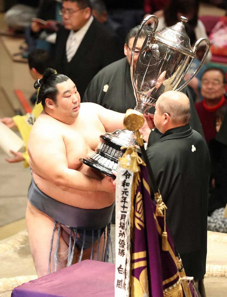 八角理事長(右)から賜杯を受け取る徳勝龍