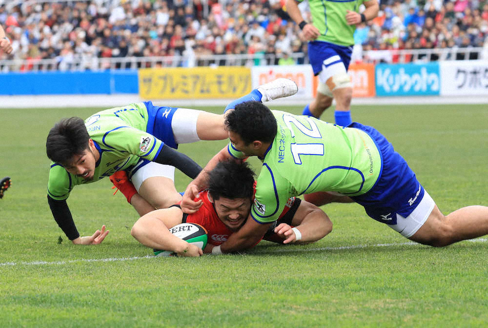 左プロップ岡部が2トライの活躍で、キヤノンが今季2勝目。「FWのみんなのおかげ」と謙遜しながらも、入団2年目のリーグ公式戦初トライに「もちろんうれしい」と口元を緩めた。関学大までバックローだったが、キヤノン入り後にフッカーに転向。今季再び転向したが、第3列で磨いたトライへの嗅覚は生きていた。前半16分に大きく抜け出したNo・8ファンダイクをサポートし、ラックから直接持ち出し20メートル先のインゴールへ。同37分にもラックサイドを突くトライを挙げ、「キャリーは強み」と走力を発揮した。