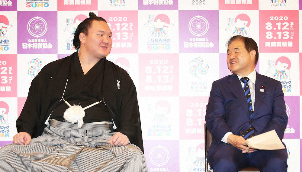 「レスリングに注目したい」と語った白鵬(左)に話しかける公益財団法人東京オリンピック・パラリンピック競技大会組織委員会会長代行・遠藤利明氏(撮影・西川祐介)